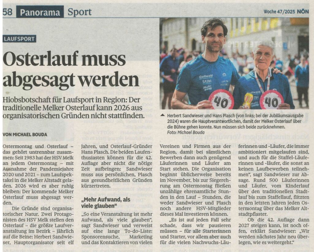 Aus organisatorischen Gründen findet der Melker Osterlauf 2026 nicht statt. Wir danken den bisherigen Läuferinnen und Läufern, Sponsoren sowie den Helfern für die Treue.
