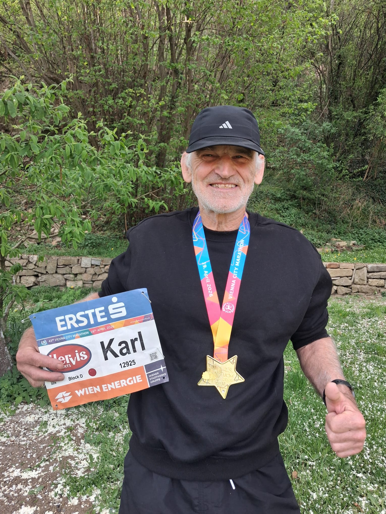Karl Miedler erhielt zu seinem 70. Geburtstag als Geschenk ein Startticket für den Marathon. Da er aus dem letzten Startblock weglaufen musste, konnte er aufgrund der vielen langsamen Teilnehmer nur im Zick-Zack-Kurs überholen und dadurch sein geplantes Tempo nicht laufen. Er finishte trotzdem zufrieden mit der Endzeit von 3:49:06 und freute sich über den 2. Rang in der Klasse M70.